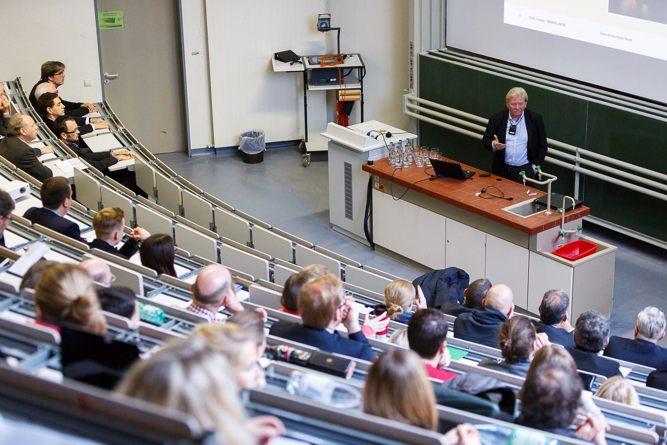 So erläuterte Prof. Dr.-Ing. Bert Bielefeld (Department Architektur) „Suffiziente Strategien in der gebauten Umwelt - Eine Antwort auf die Grenzen der Effizienz“ auf. Ministerialrat Karl Jasper (Ministerium für Heimat, Kommunales, Bau und Gleichstellung des Landes NRW), zeigte in seinem Vortrag „Retentionsraum Stadt - Bedeutung des Wassers in der integrierten Stadterneuerung“ am Beispiel des Emscherlandschaftsparks auf, wie Gewässer in die Stadtplanung eingebunden werden können und damit gleichzeitig ein präventiver Hochwasserschutz für drohende Starkregenereignisse geschaffen werden kann.
