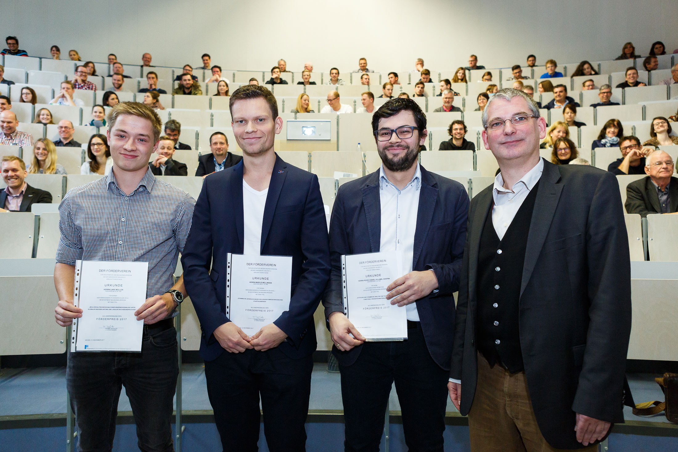 Einmal mehr bildete der Siegener Bautag den Rahmen für die Preisverleihung für hervorragende Abschlussarbeiten der Studierenden. Für ihren herausragenden Bachelorabschluss wurden Catharina Weitz (Untersuchungen zur Auswirkung der Anforderungen der Energieeinsparverordnung auf Nichtwohngebäude am Beispiel von Modulbauten der Firma KLEUSBERG; Betreuer: Prof. Schmidt, Baukonstruktion) und Lars Müller (Beulverhalten der Schale einer Windenergieanlage unter globaler Biegebelastung und lokaler Druckbeanspruchung; Betreuer: Prof. Pak, Stahlbau) ausgezeichnet. Über einen Preis für ihren ausgezeichneten Masterabschluss konnten sich Marius Mellmann (Dynamische Untersuchungen von vorverformten periodischen Stabtragwerken; Betreuer: Prof. Zhang, Baustatik) und Lukas Witowski (Vergleich zweier Konstruktionsvarianten eines ABUS Einträgerhalbportalkrans (EHPK) unter Berücksichtigung der Einflüsse Theorie II. Ordnung mit besonderem Augenmerk auf die Traglast-/Spannweitenbeziehung; Betreuer: Prof. Pak, Stahlbau) freuen. Darüber hinaus wurde die mit der bestmöglichen Auszeichnung „Summa cum laude“ bewertete Promotion von Pedro Villamil Oostra (Statische und dynamische Analyse von Tragwerken aus funktional gradierten Materialien; Betreuer: Prof. Zhang, Baustatik) geehrt. Alle Geehrten wurden mit Preisgeldern vom Förderverein Architektur und Bauingenieurwesen der Universität Siegen ausgezeichnet.