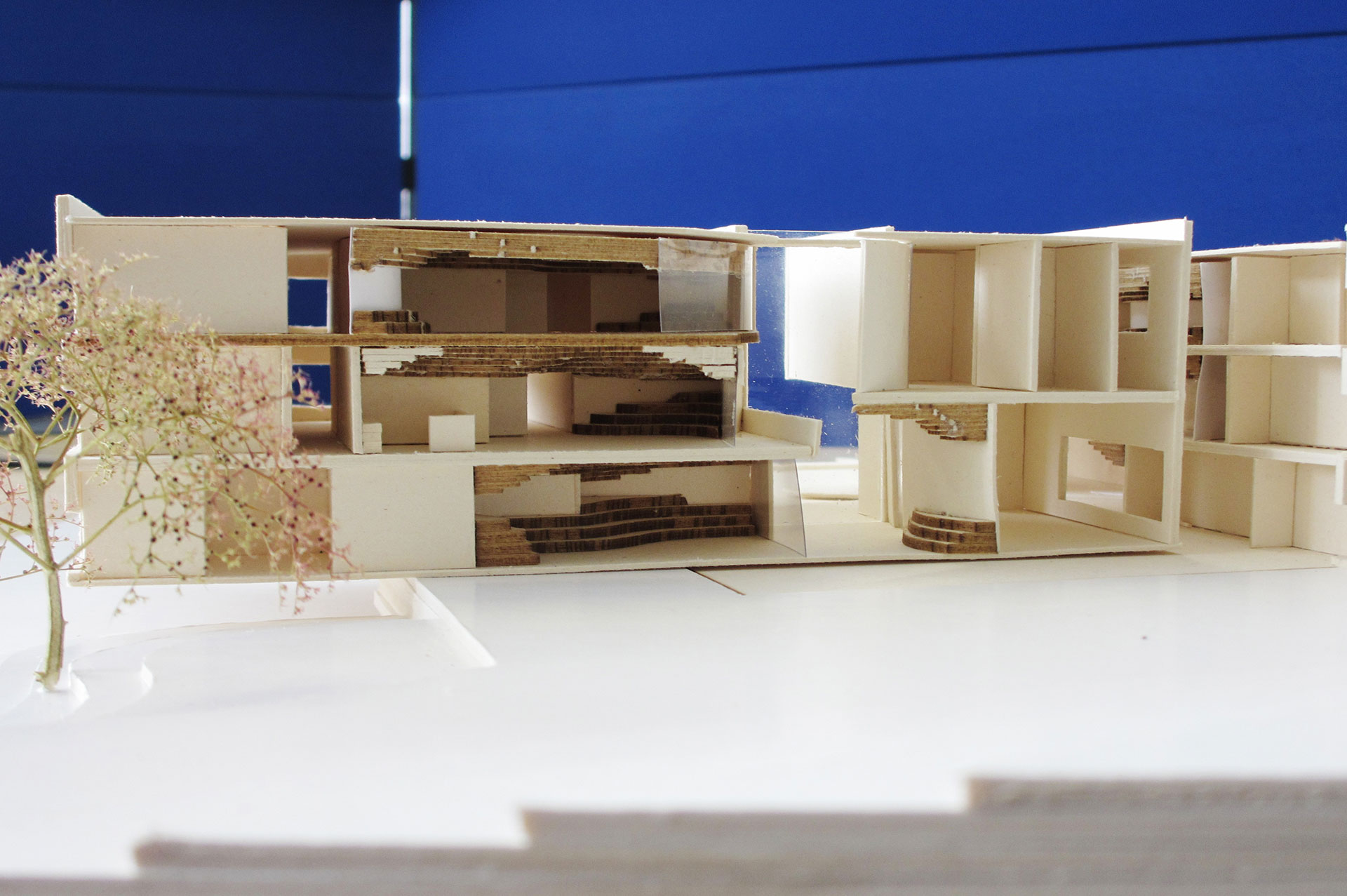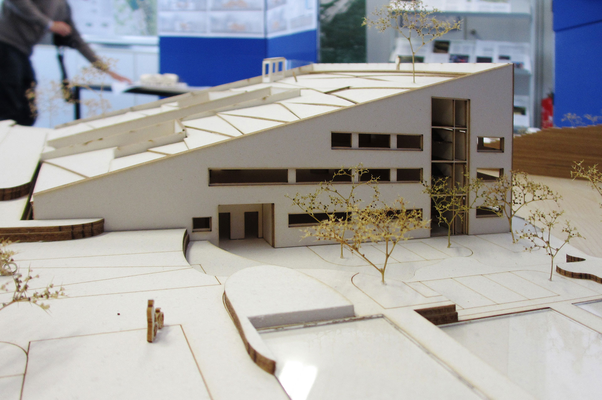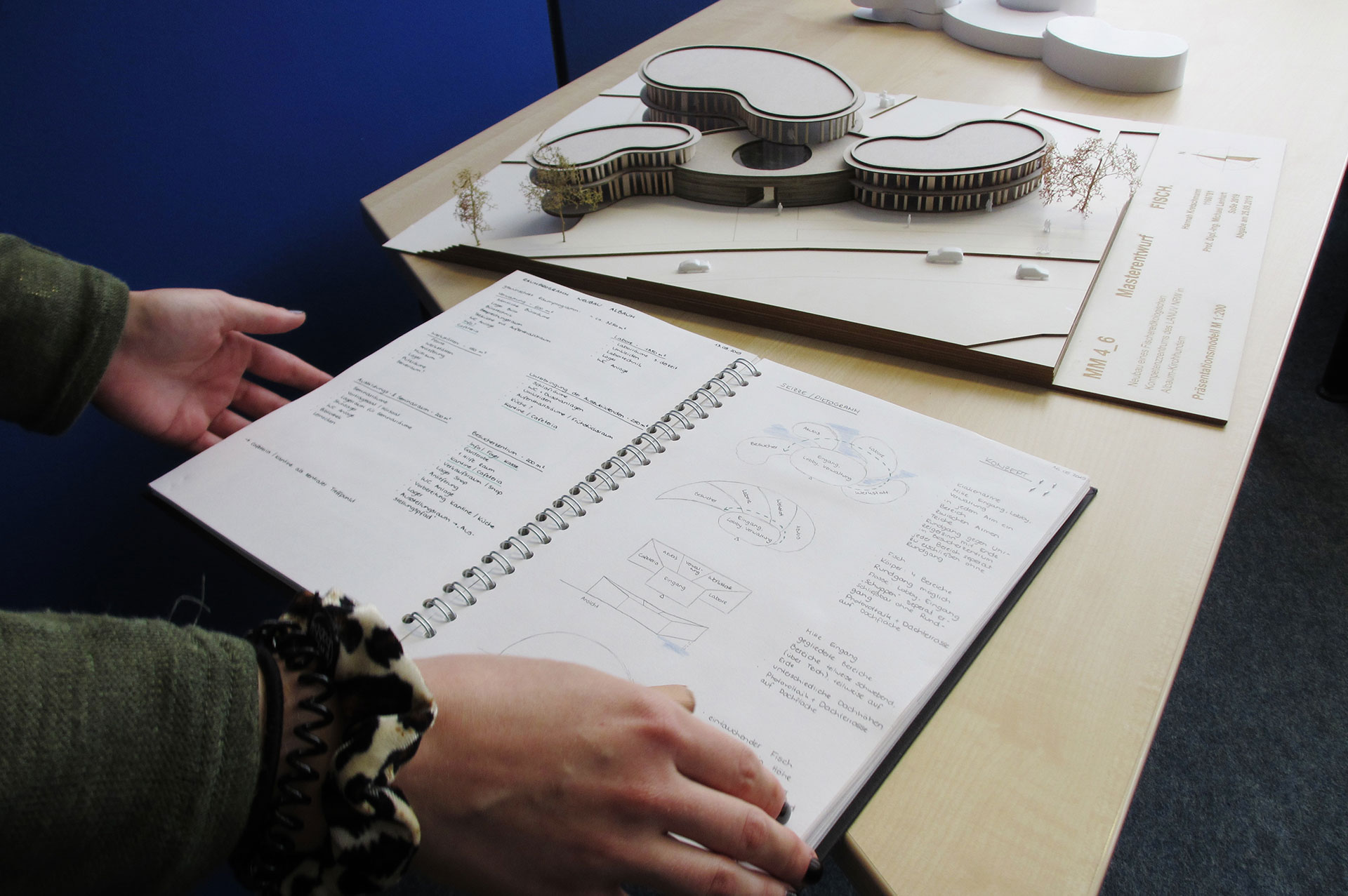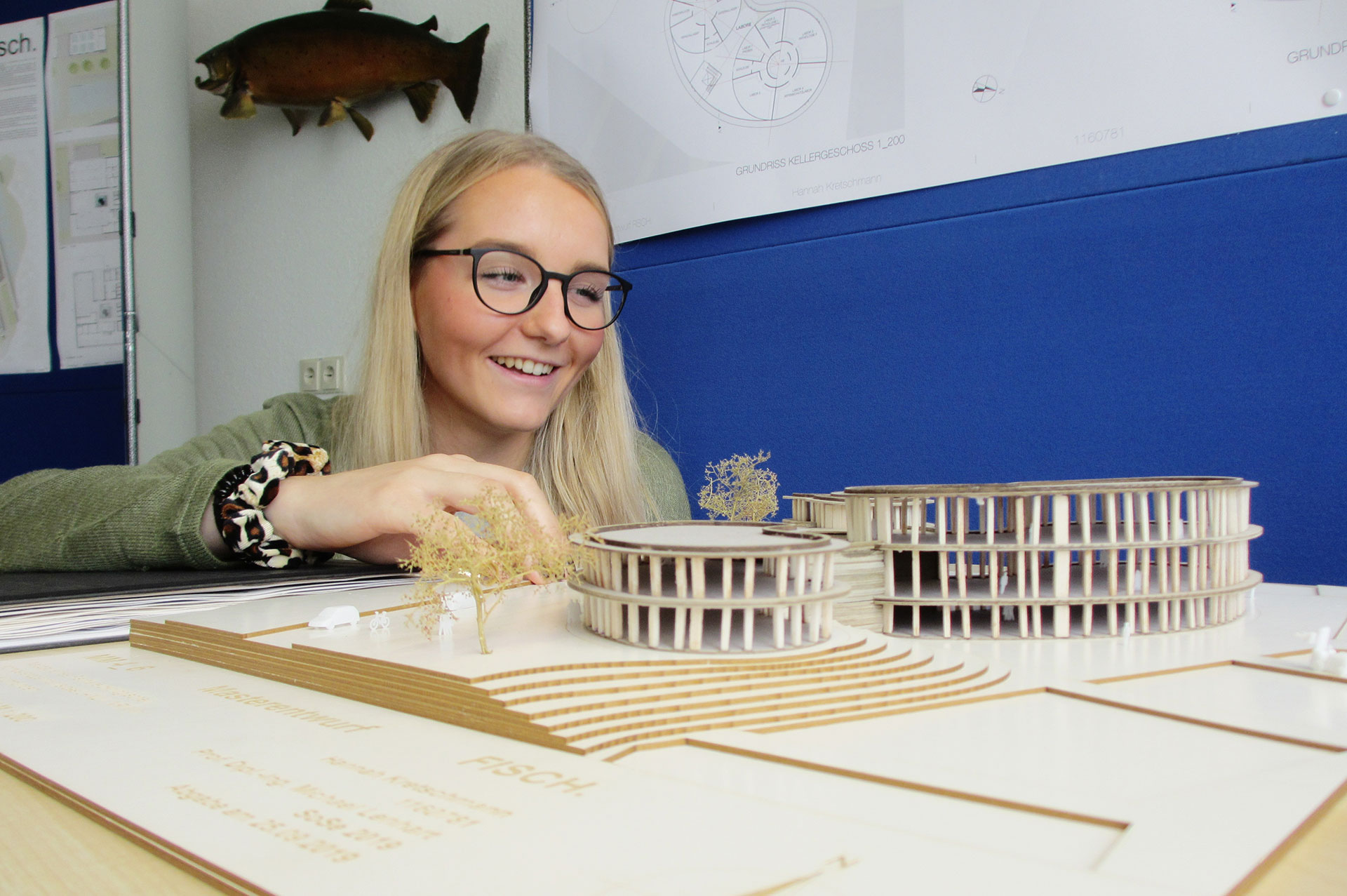 Studentin Hannah Kretschmann fand schnell einen Zugang zu dem Neubauvorhaben: „Ich habe zuerst alle Wörter aufgeschrieben, die mir zum Thema Fisch in den Kopf kamen und dann diejenigen unterstrichen, die ich mit Architektur in Verbindung bringe.“ Ihr Entwurf setzt sich aus vier Gebäudeteilen zusammen, in diesen befinden sich ein Empfangsbereich mit Showroom, ein Verwaltungstrakt, diverse Labore sowie ein Besucherzentrum mit zwei Seminarräumen. Um die Gebäude herum sind Teichanlagen angeordnet. „Den Mittelpunkt des Gebäudeensembles bildet ein massiver Eingangsbereich in Form einer Ellipse. Als geschlossener Kern mit Sichtbetonfassade steht sie im Gegensatz zu der offenen, vorgehängten Holzpfosten-Fassade, die die anderen drei Gebäude umgibt und die viel Licht ins Innere lässt“, erklärt Hannah Kretschmann. „Das Highlight meines Masterentwurfs ist der Showroom, in dem für die Besucher Aquarien ausgestellt sind und in dem eine dunkle, mystische Atmosphäre wie in der Tiefe des Meeres herrscht.“