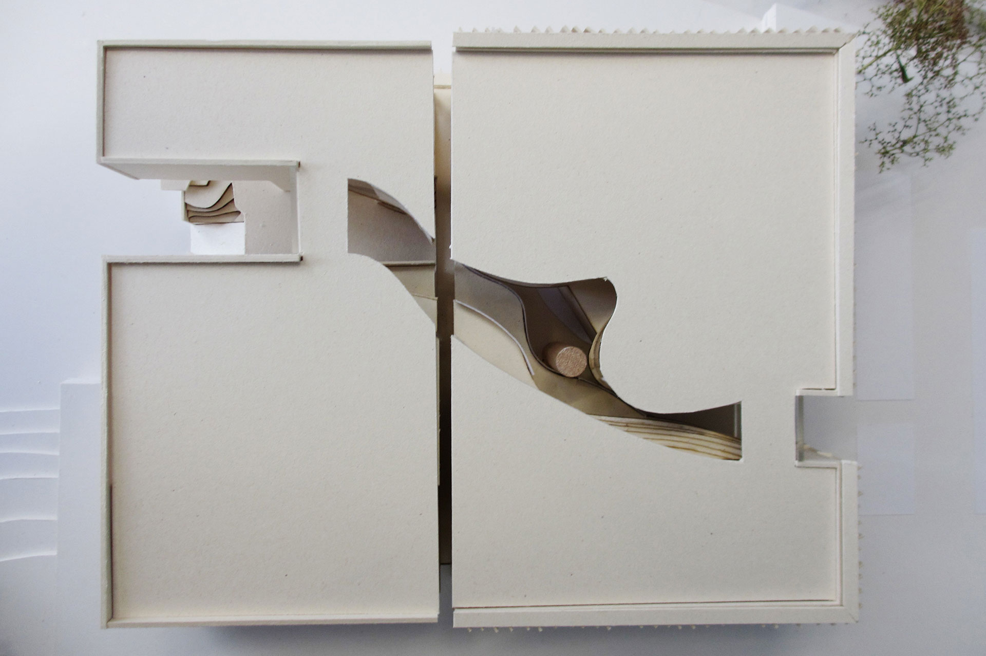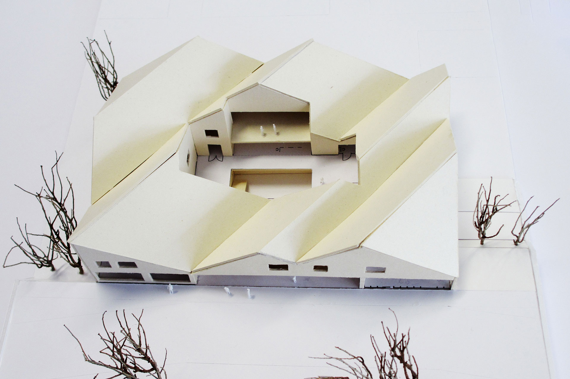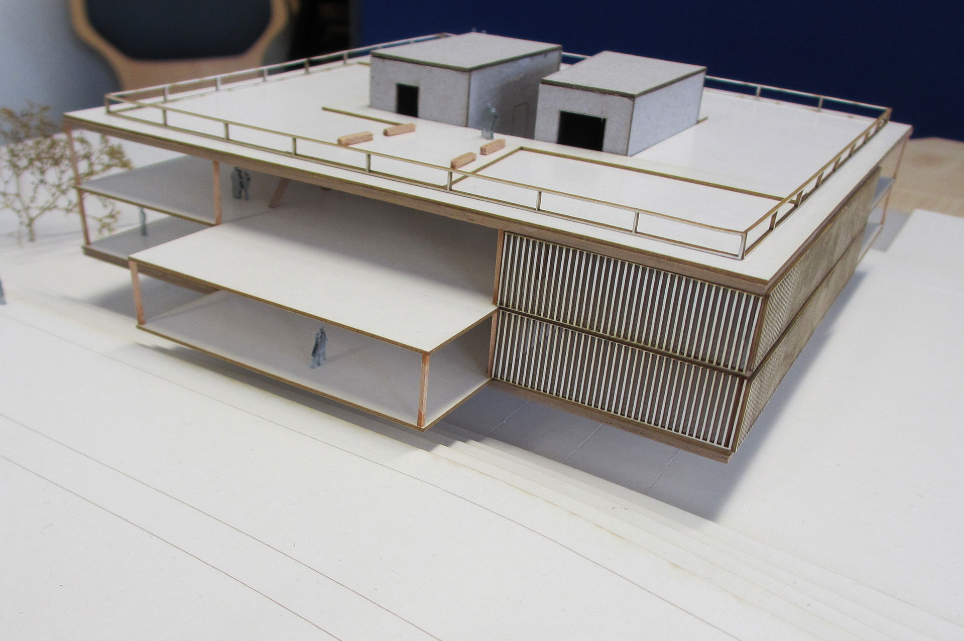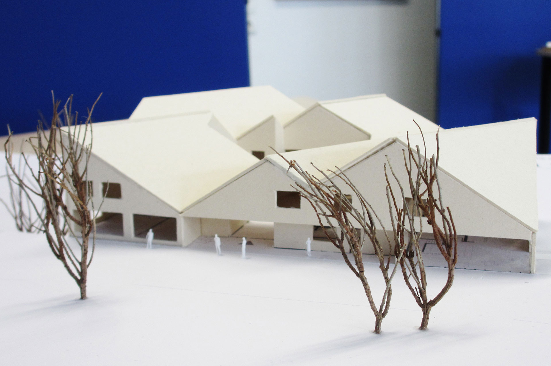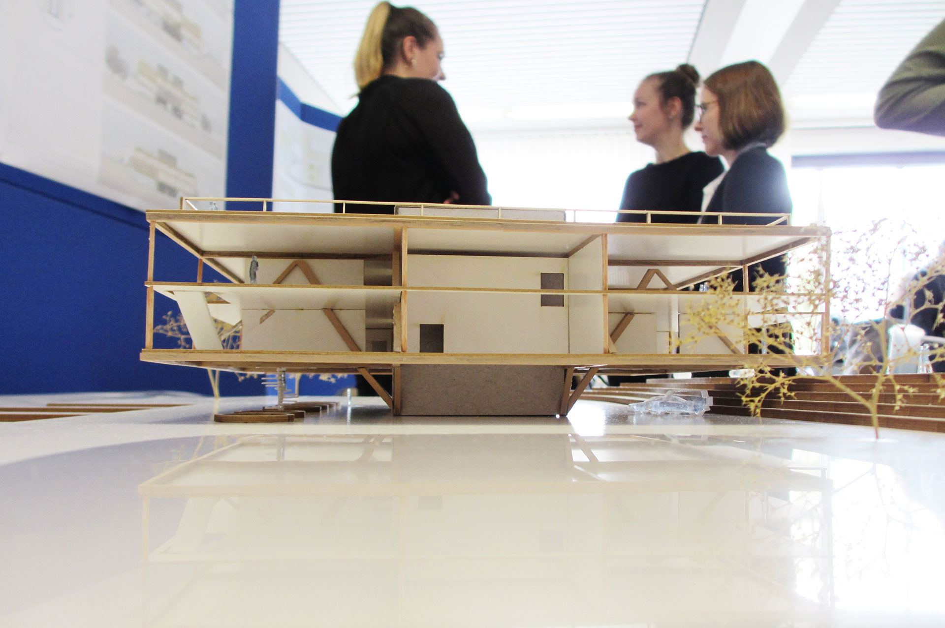 Ein ganzes Semester über haben die Studenten an ihren Masterentwürfen gearbeitet und sie in vier Workshops mit BLB-NRW- und LANUV-Vertretern immer weiterentwickelt. Ein Entwurf greift die dörflichen Strukturen vor Ort auf und ziert Satteldächer, ein anderer ist vom örtlichen Bach inspiriert, der einen großen Gebäudekörper gedanklich durchtrennt und so einen geschwungenen Durchgang mitten durch das Bauwerk bildet. Wieder ein anderer Entwurf ist dem Ein- und Auftauchen eines Fisches nachempfunden. Studentin Teresa Schmidt setzt bei ihrem Entwurf auf einen zentralen Doppelkern aus Stahlbeton als tragendes Element, das den Boden berührt. An diesen Kern hat sie das Erd- und Obergeschoss als reine Holzkonstruktion mit Fachwerk angehängt. „Das Dach ist über die Kerne zugänglich, dort befinden sich verschiedene Aufenthaltsflächen mit Ausblick auf die Umgebung und Technikflächen für Photovoltaik. Außerdem ist das Dach begrünt“, beschreibt Teresa Schmidt. „Ich wohne in einem Nachbarort und fand besonders die regionale Nähe zu dem Projekt interessant. Die Verantwortlichen des BLB NRW haben uns bei unseren Arbeiten ermutigt, innovativ und offen für neue Ansätze zu sein, ruhig mal etwas Außergewöhnliches auszuprobieren und aus Mustern auszubrechen“, erzählt Teresa Schmidt. „Sie haben uns konstruktive Kritik gegeben, das fand ich sehr gut.“ Dem schließt sich Studentin Hannah Kretschmann an: „Mir hat die Zusammenarbeit mit dem BLB NRW richtig Spaß gemacht, weil das Projekt dadurch einen realitätsnahen Bezug bekam und weil ich aus den Rückmeldungen seitens des BLB NRW viel gelernt habe.“ Universitätsprofessor Michael Lenhart: „Solch ein Projekt ist für die Studenten eine riesen Chance jede Menge Praxiserfahrung zu sammeln und das bei einem realen Partner, der selbst viele Liegenschaften besitzt.“